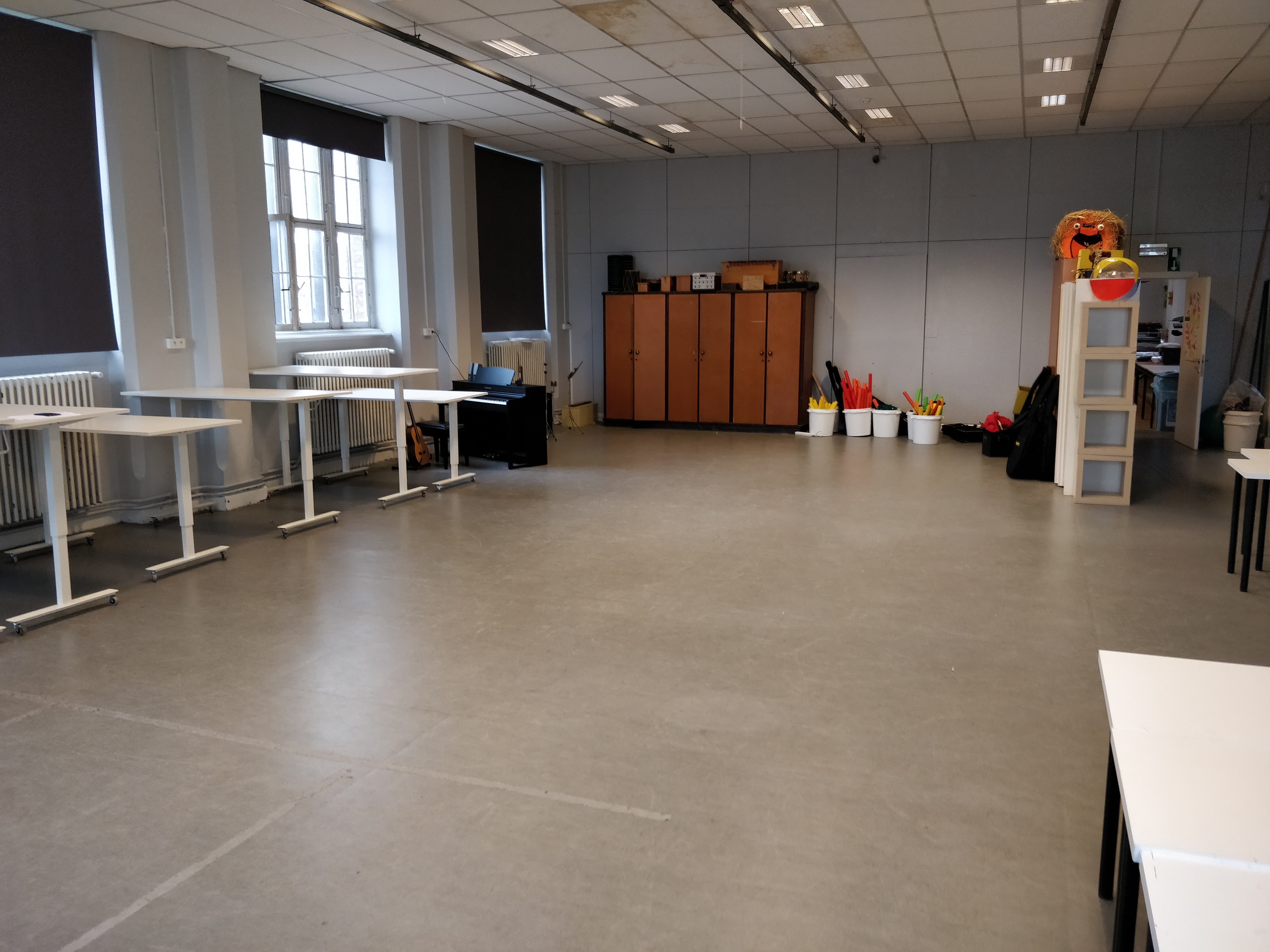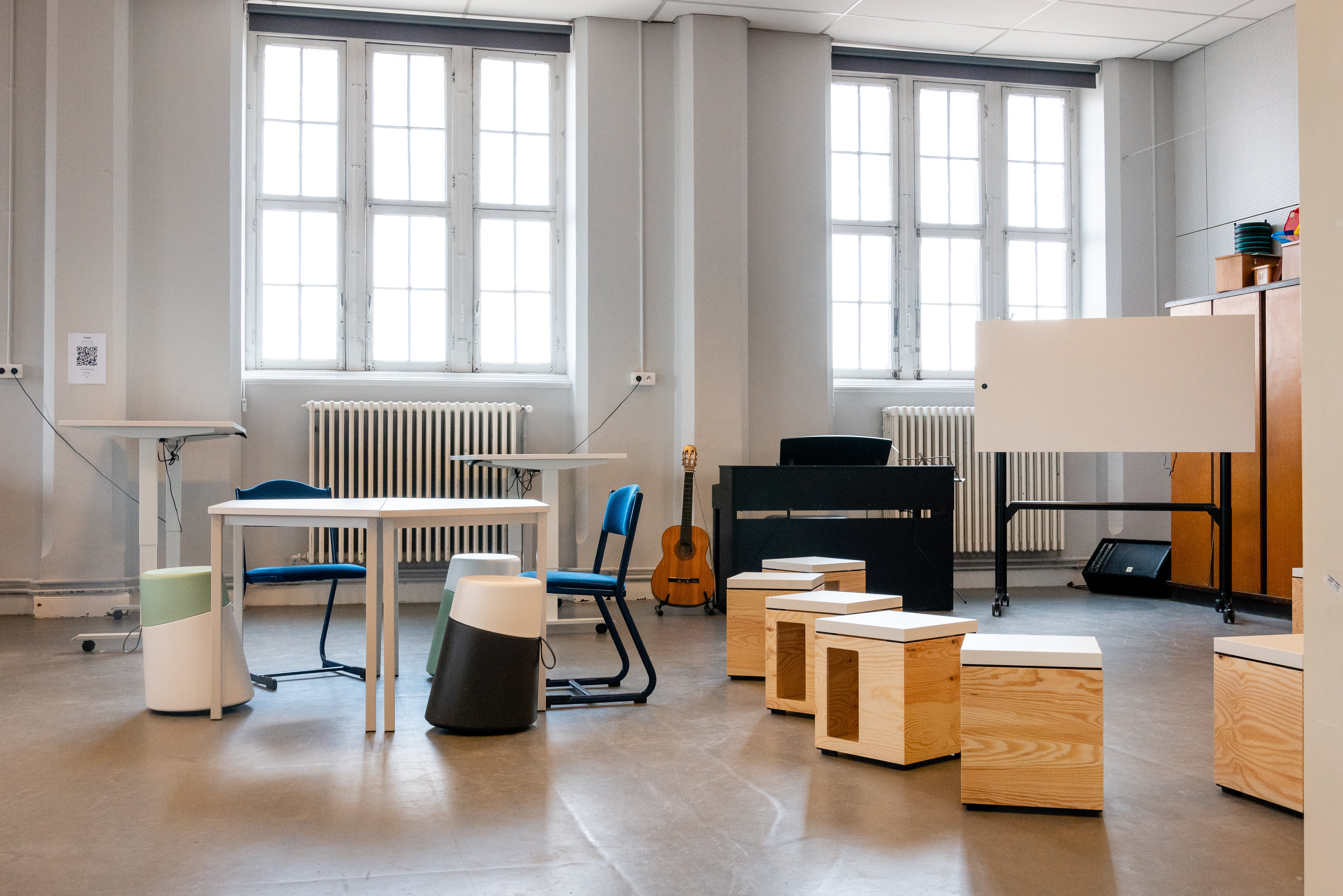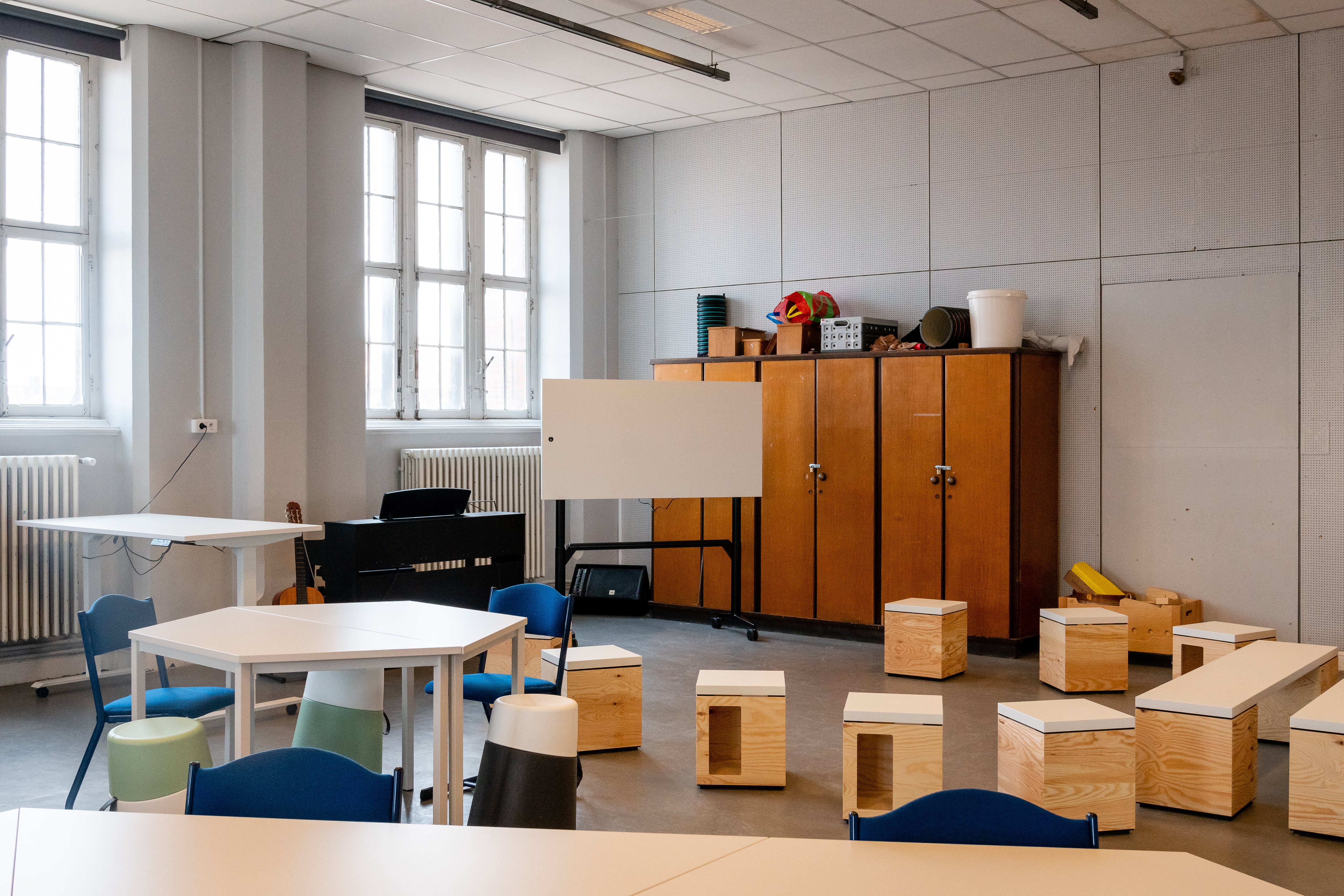 This classroom is the base classroom for the music education classes in the teacher study programme. It allows different class set-ups to be created in no time at all: circle activities, group work, show moments of a classic hearing college. Thanks to light materials, sitting-standing tables on wheels and the modular concept, teachers and students can organize their own furniture arrangement. Sufficient storage space ensures that being mobile is a condition to easily change from dynamic sitting to standing and moving.
