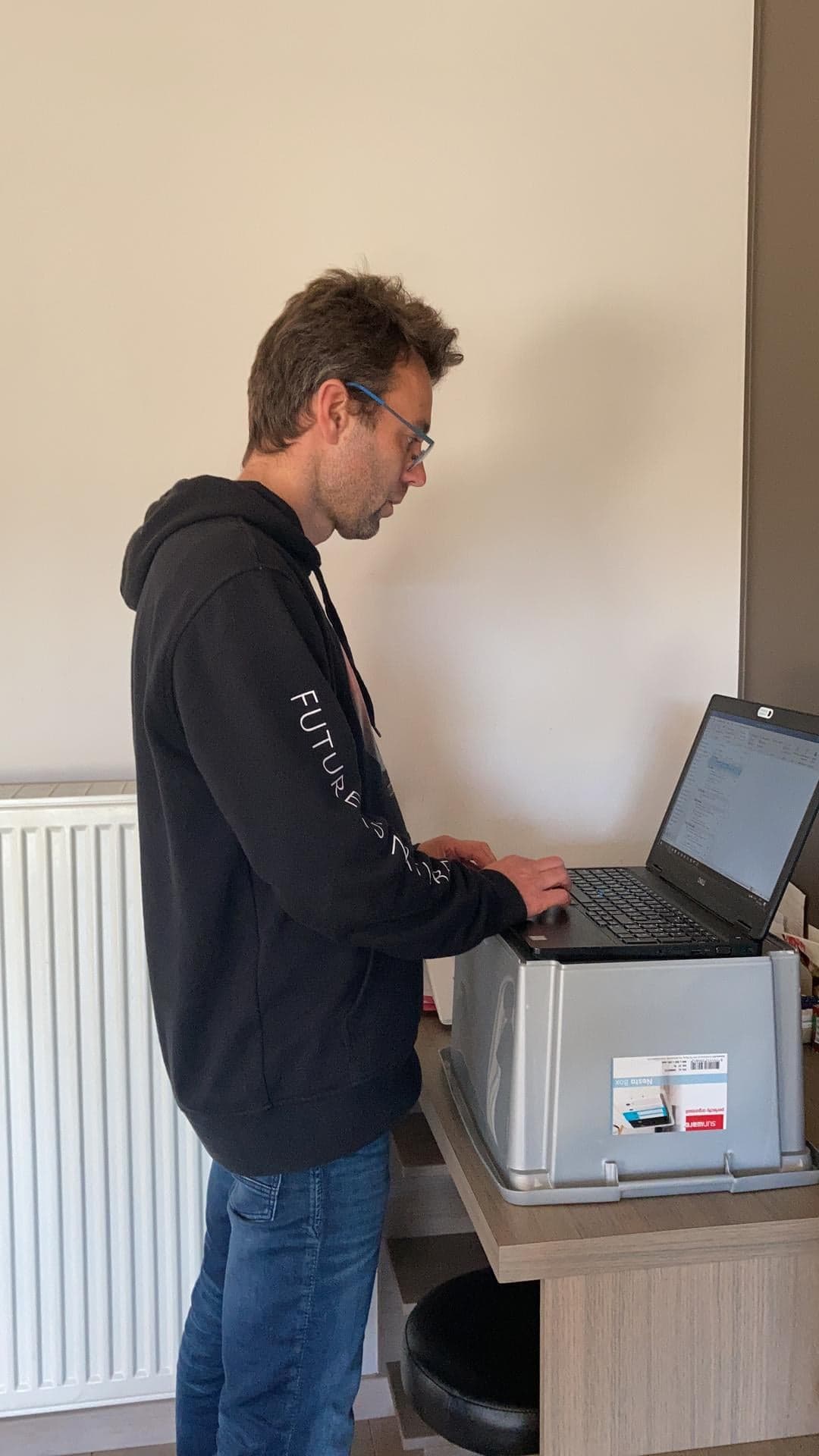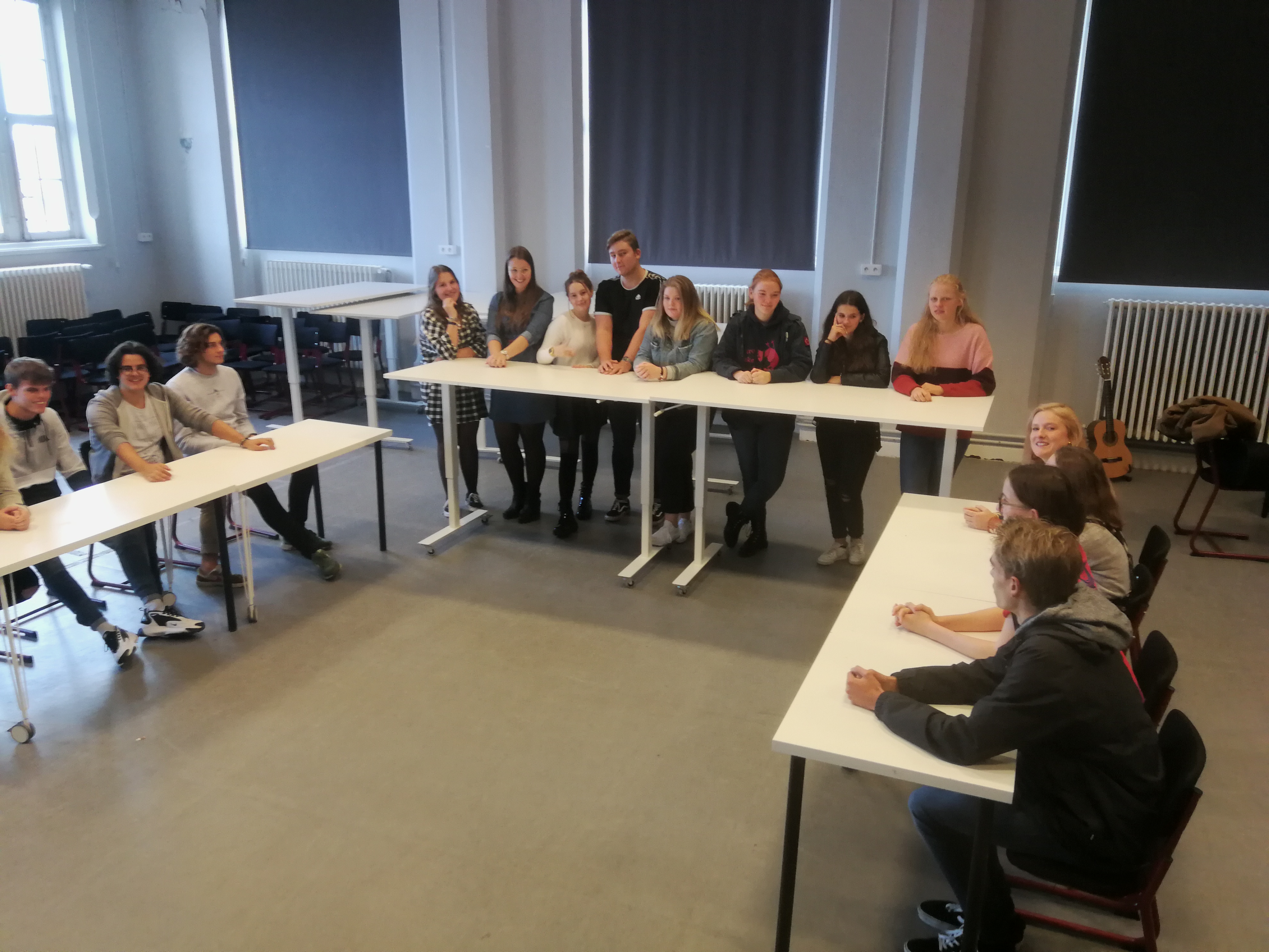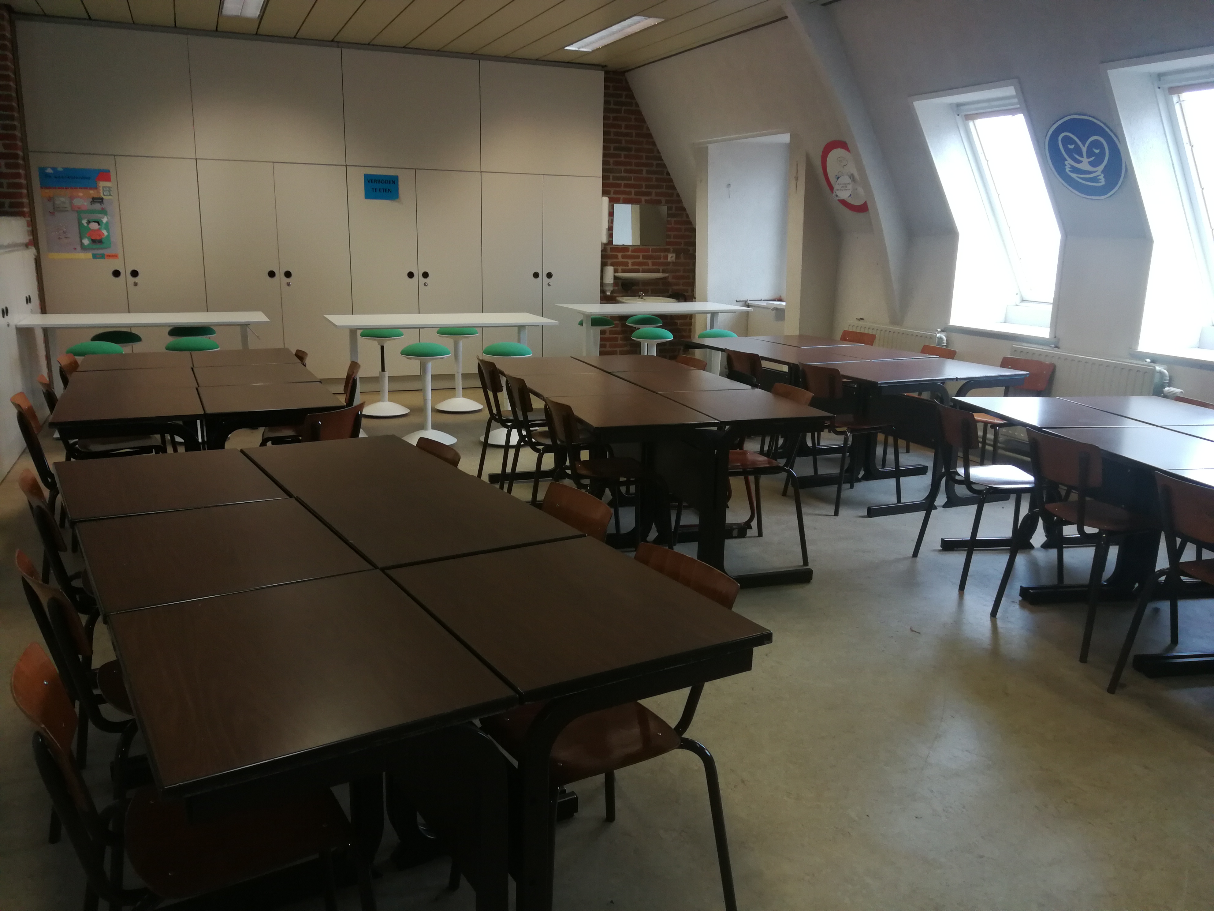 In this project, we progressively integrated sitting-standing tables into the classroom. At the start, 1 table has been added. The teachers could use it in different ways: instruction area for the whole class, to offer care to a small group, hand skills, place for correction keys, ... Another way was to have 4 students in turn work at this table. In the process, their personal belongings were stored in a chest of drawers.