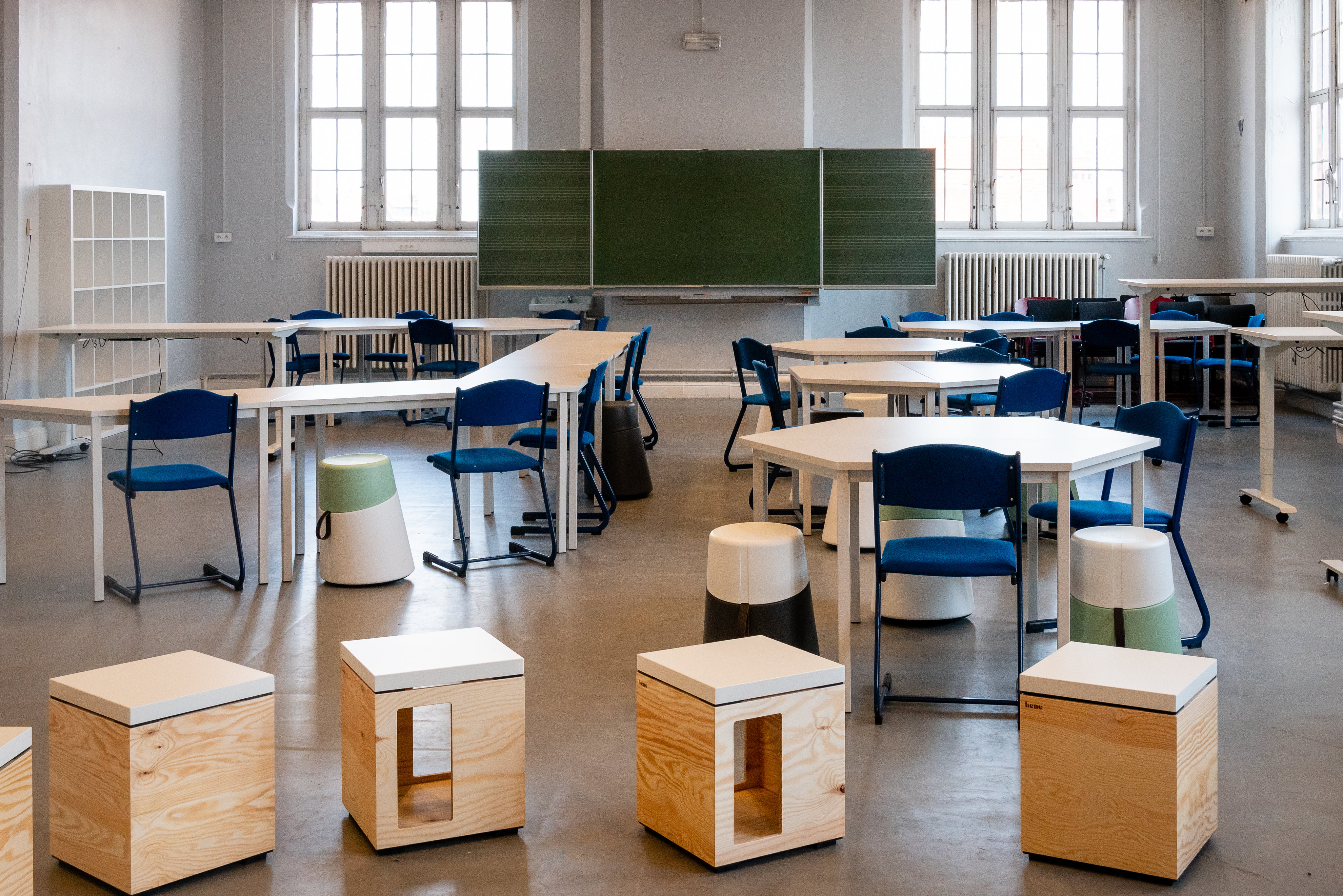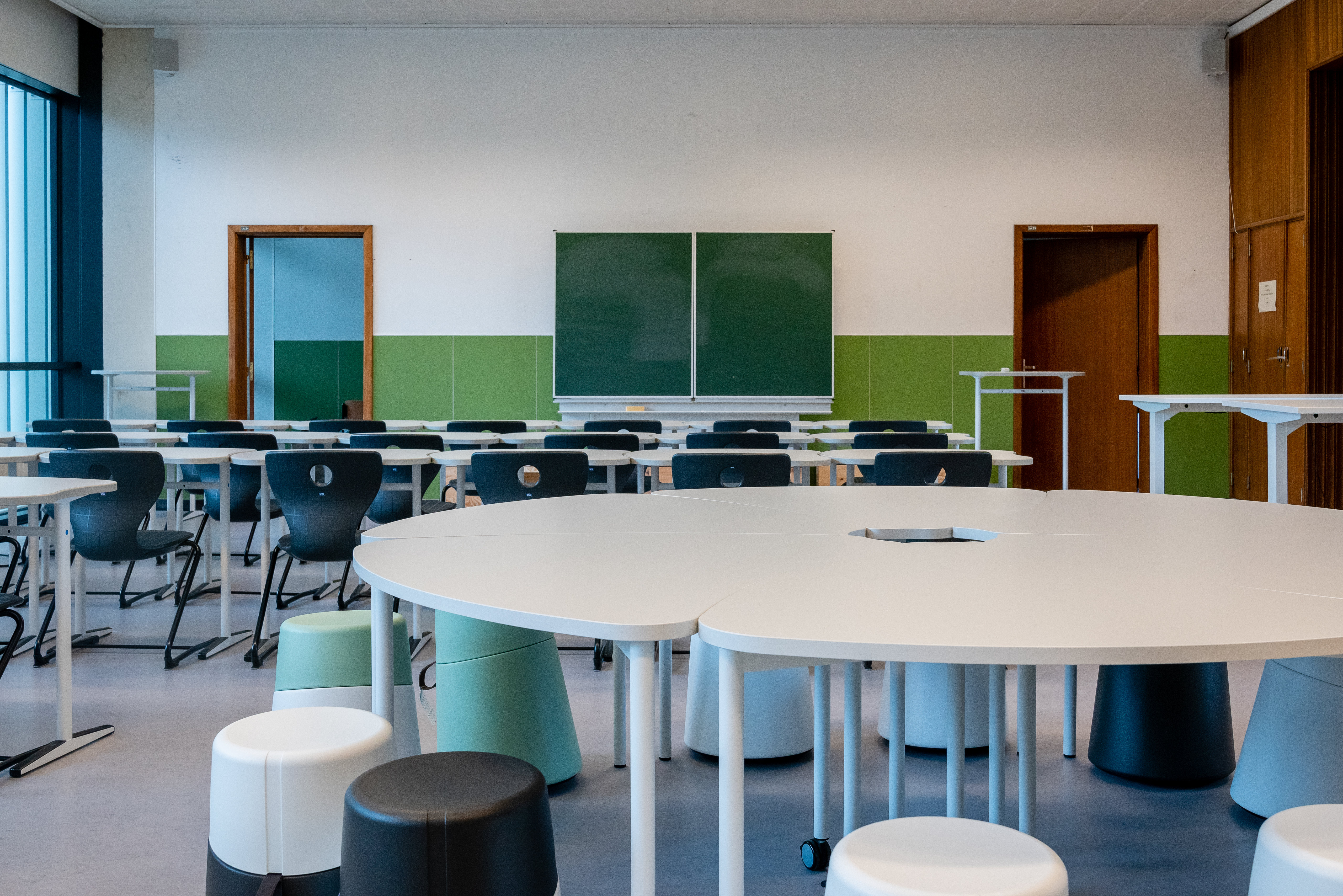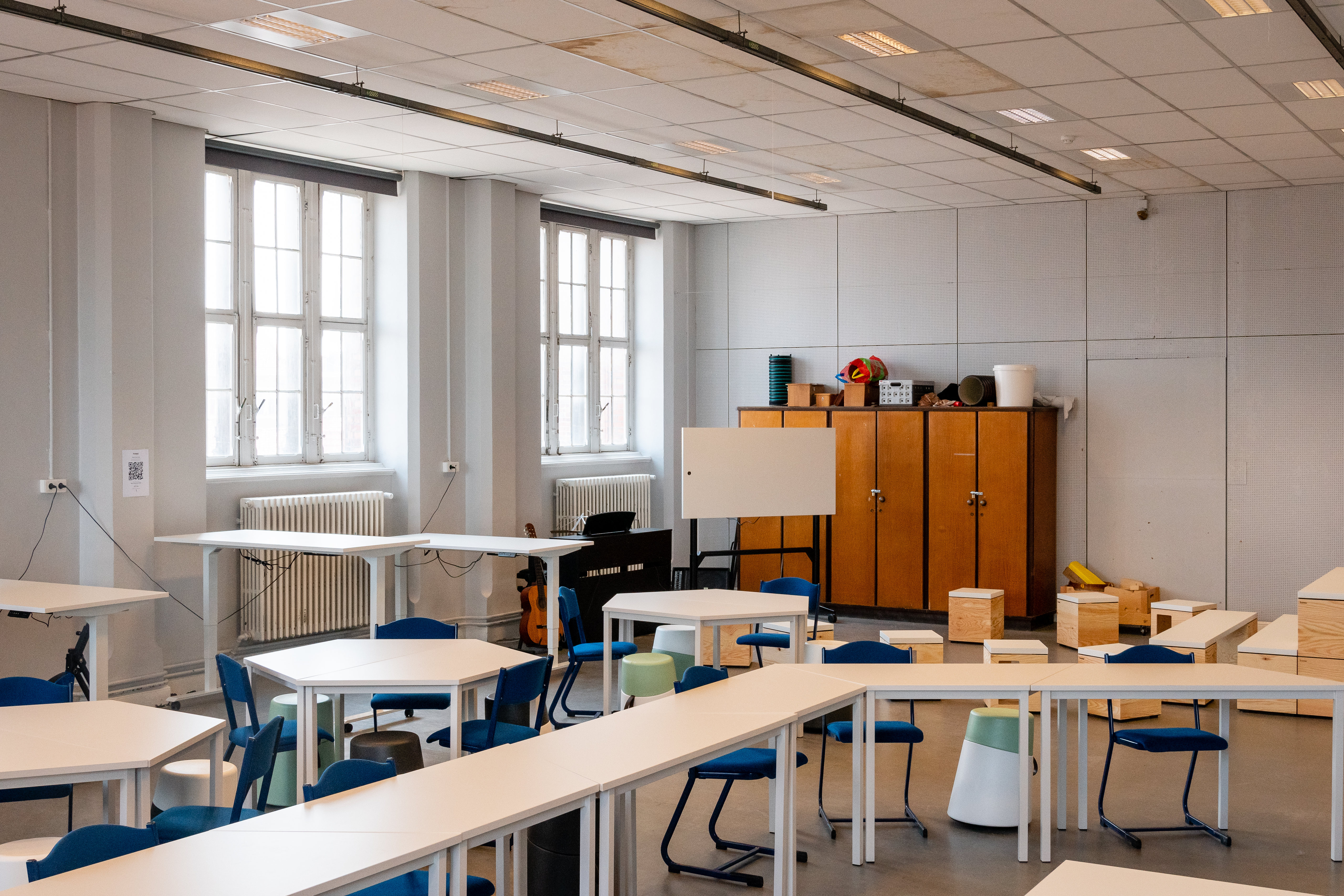 This classroom has been adapted to maximally facilitate active work formats. Individual tables that can be easily moved to different configurations are combined with dynamic seating furniture. In addition, sitting-standing tables were also placed at the side and at the back of the classroom. At the front and at the back of the classroom, there is space for beamer projections. In addition, there is also a whiteboard. An adjacent small room was set up as additional instruction room for small groups and also as storage room for students.