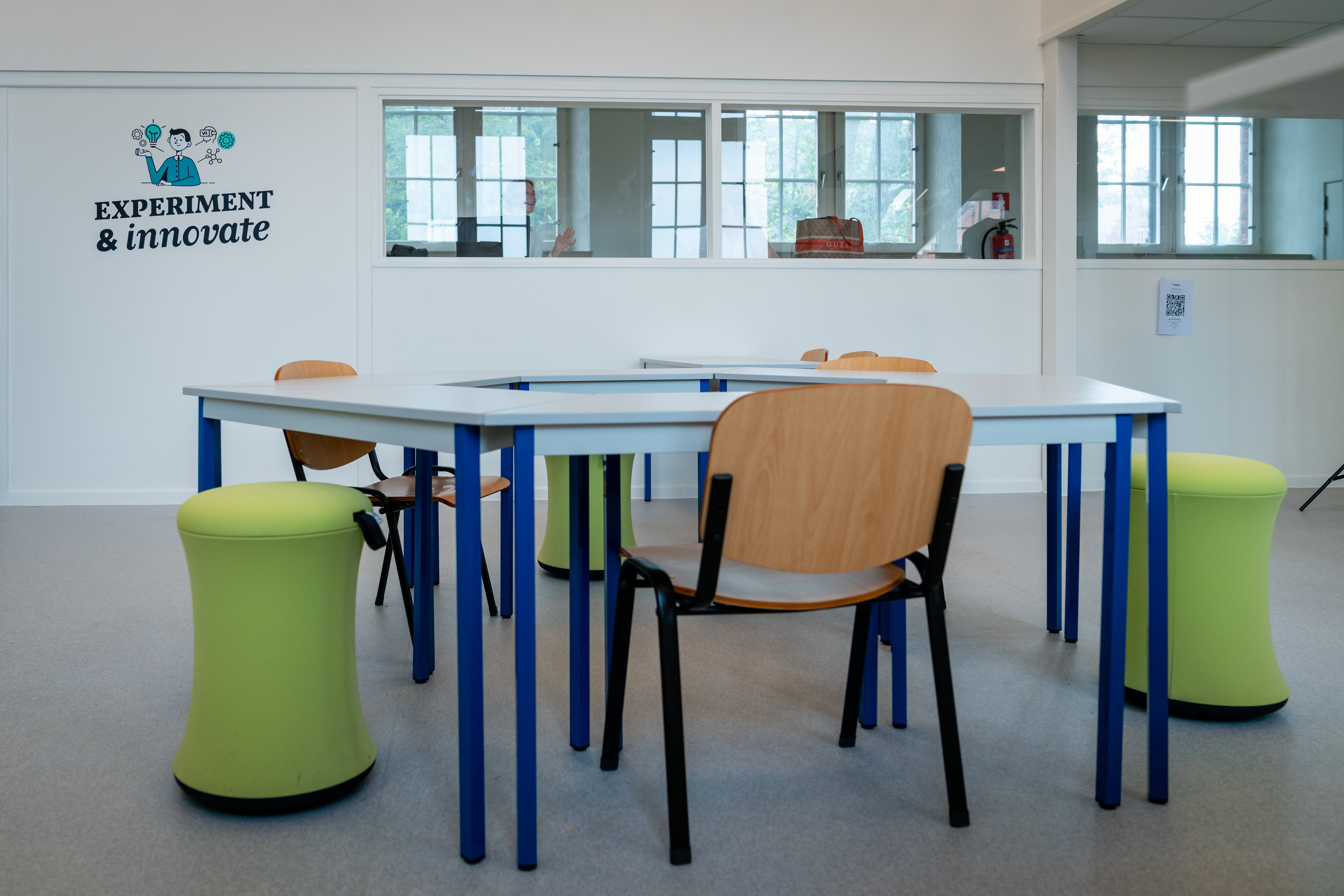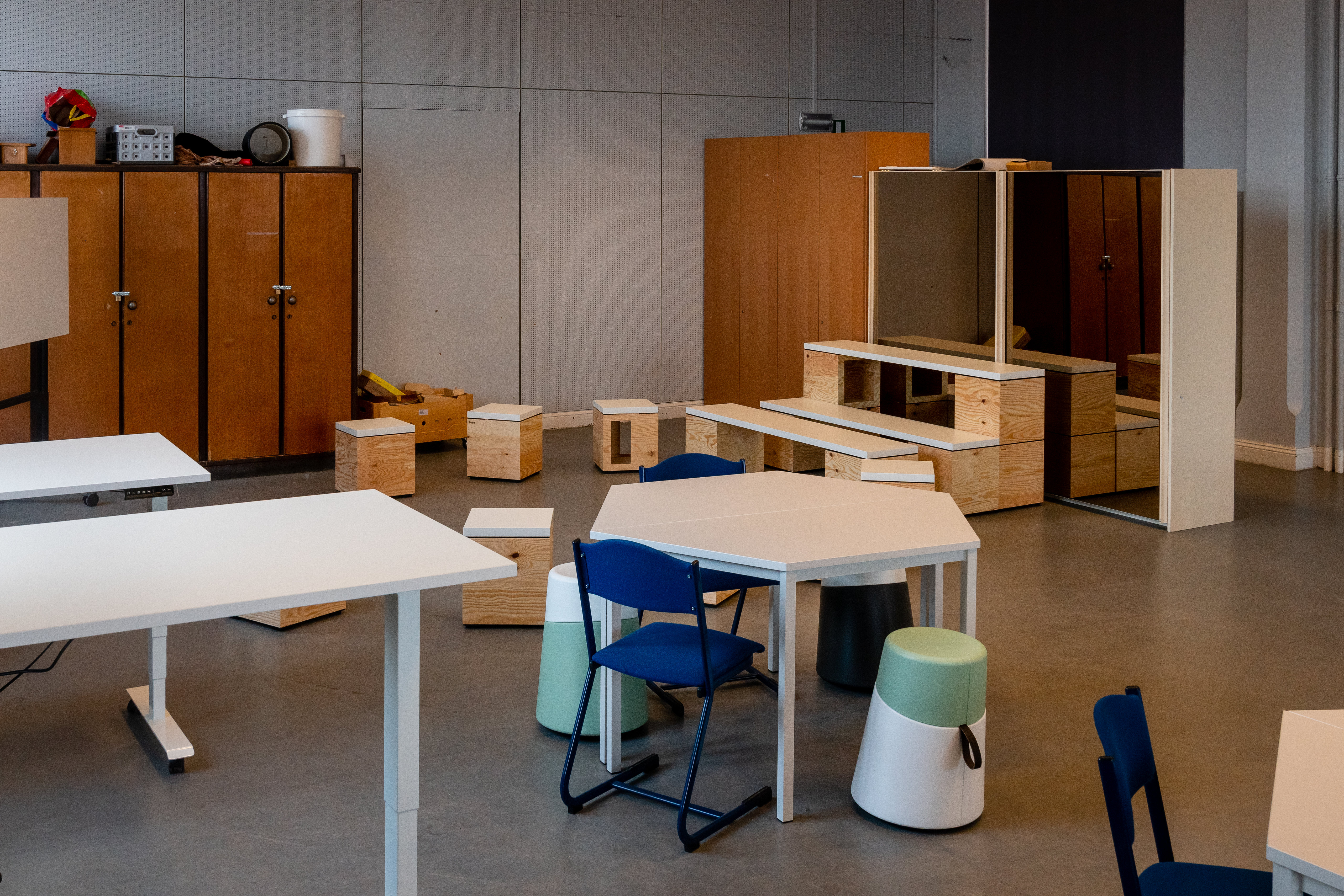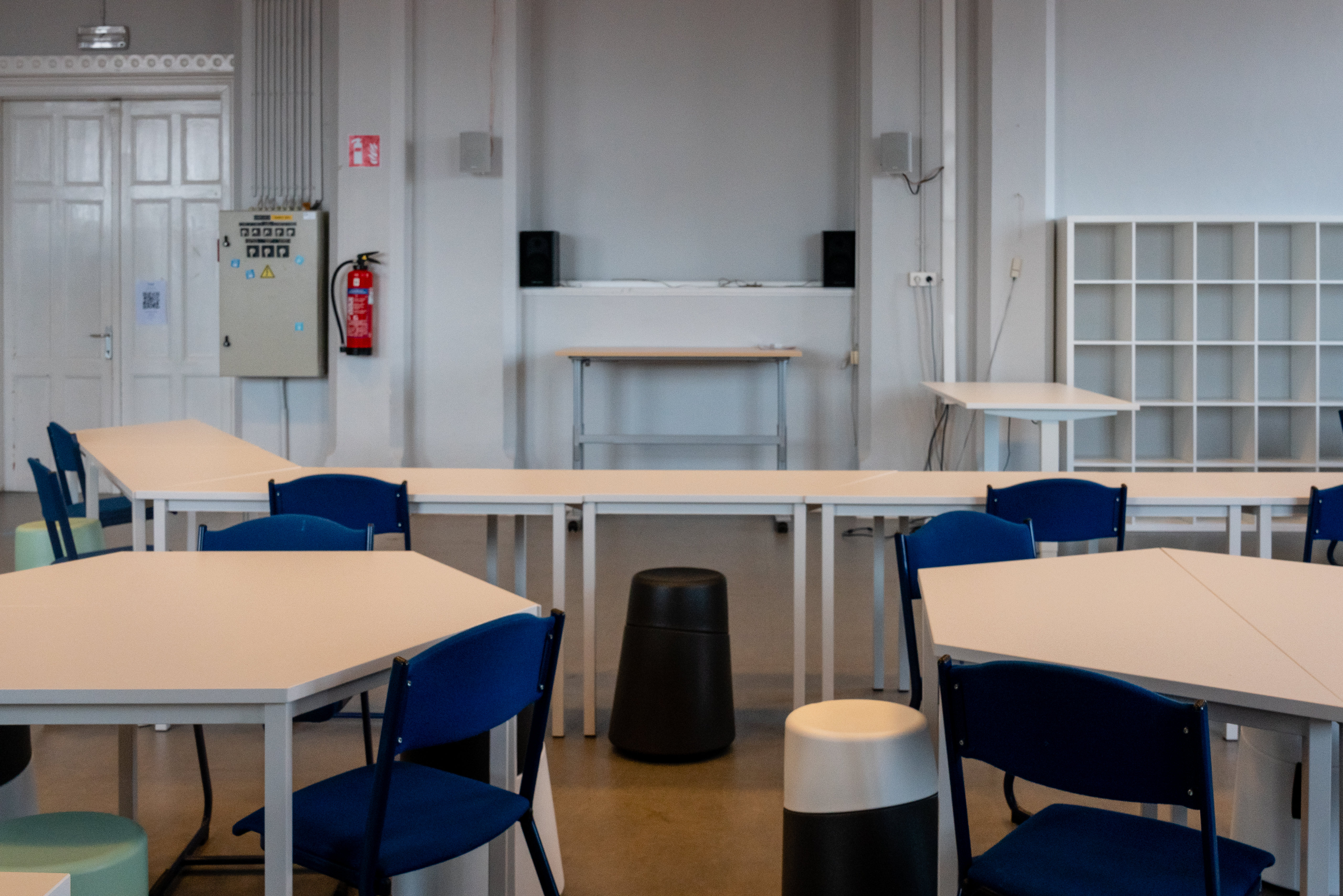 This classroom has been adapted to maximally facilitate active work formats. Individual tables that can be easily moved to different configurations are combined with dynamic seating furniture. In addition, sitting-standing tables were also placed at the side and at the back of the classroom. At the front and at the back of the classroom, there is space for beamer projections. In addition, there is also a whiteboard. An adjacent small room was set up as additional instruction room for small groups and also as storage room for students.