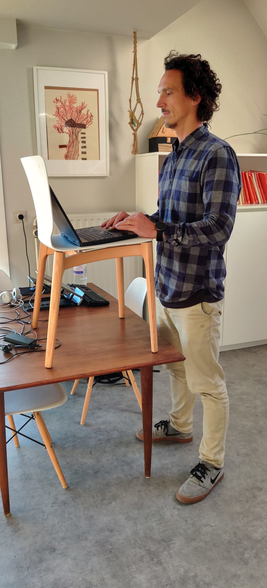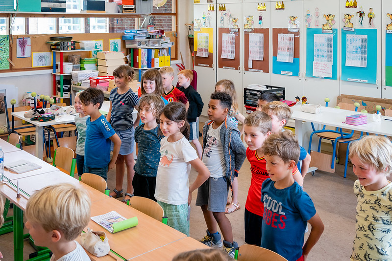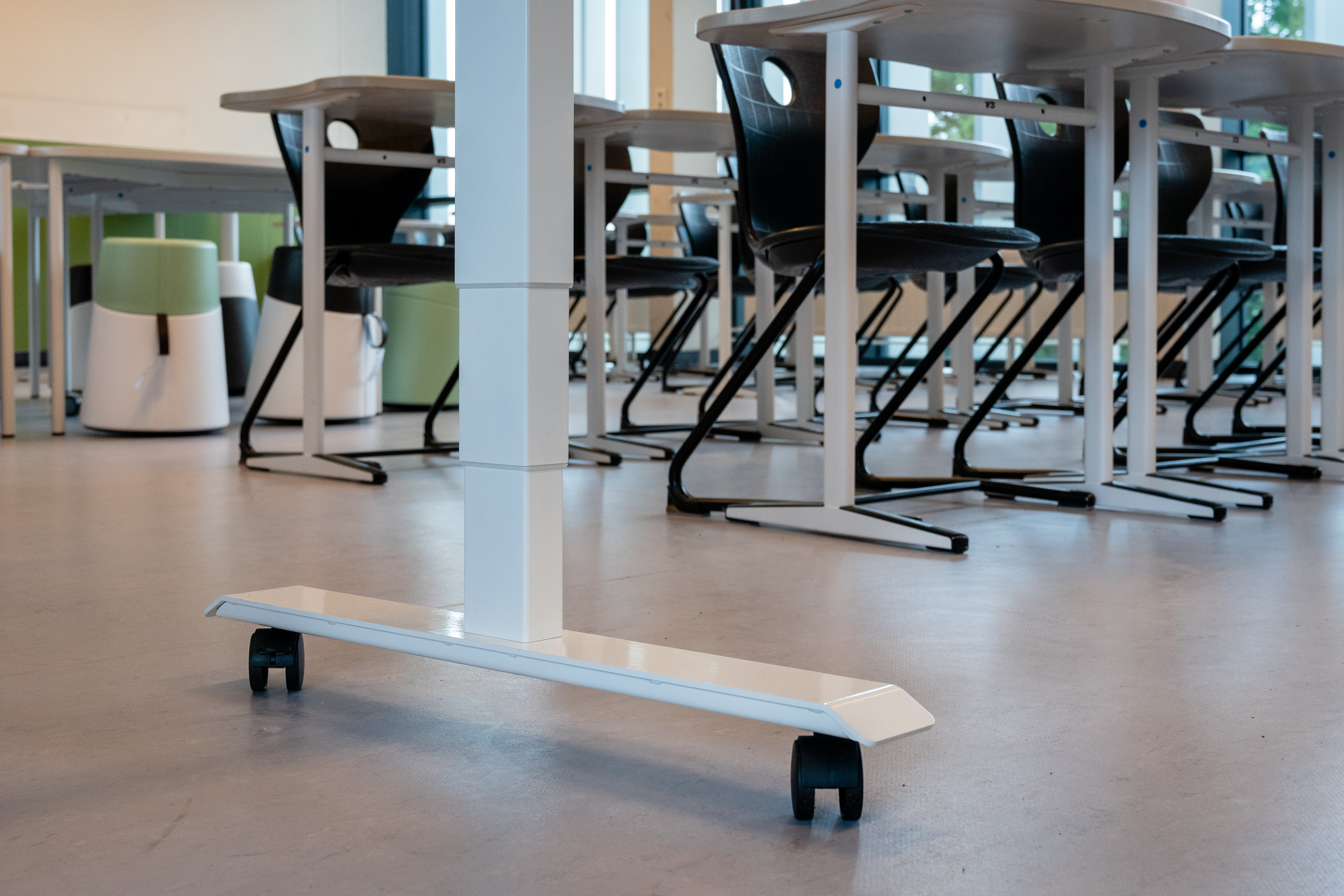 A next step was to replace half of all the tables in the classroom by sitting-standing tables. The children change their arrangement independently throughout the day: starting with classic sitting, chairs sliding away in a lock and the table to work while standing up. Thanks to the wheels, the tables also roll away quickly to create more space in the classroom. In this way you can switch from a classic setup to a completely empty classroom in less than 3 minutes every time. It gives you the opportunity to make happen dynamic sitting, standing and moving within the four classroom walls.