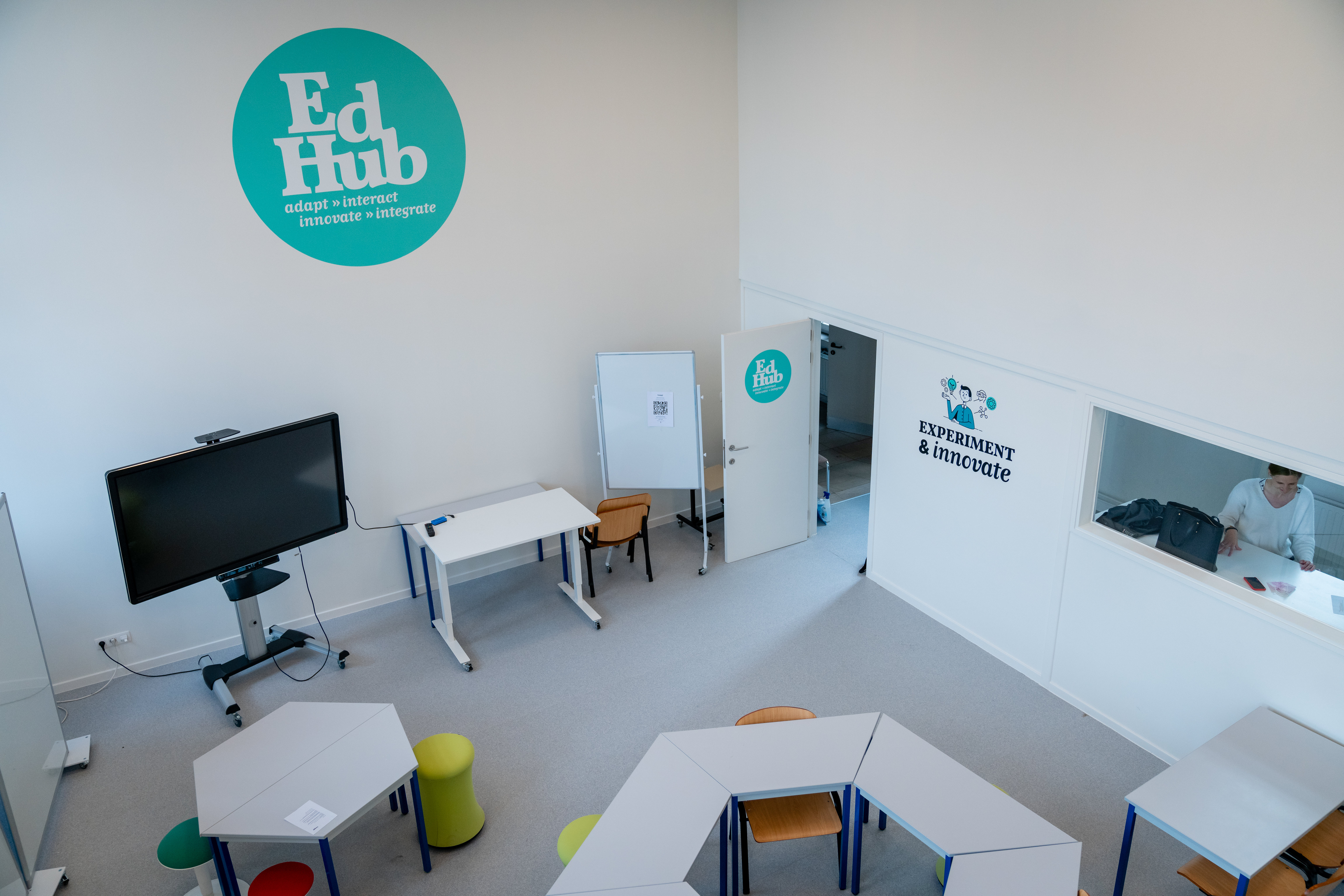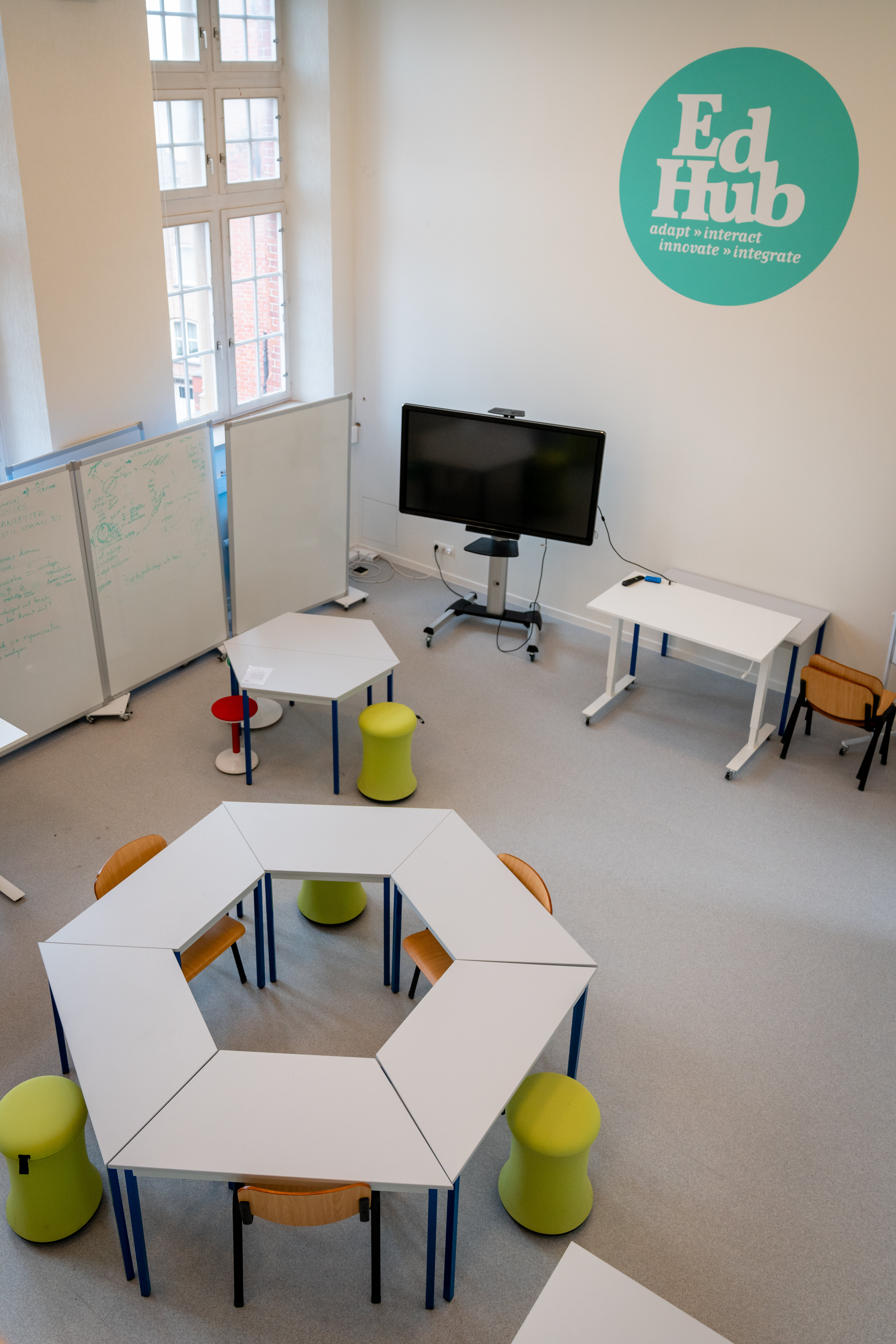 In this room, the interaction between didactics, technology and space was an important item. EdHub therefore aims to help bridge the gap in terms of applications and educational practice and has created a space for the professional field and students to work in. Here, focus is not on working with ICT during the tool-oriented workshops, but on the coherence of a fully elaborated didactic framework, a flexible and inspiring environment/room. The EdHub classroom is designed as a room for experiments for students, lecturers and the professional field. You can among other things work with screen-sharing.