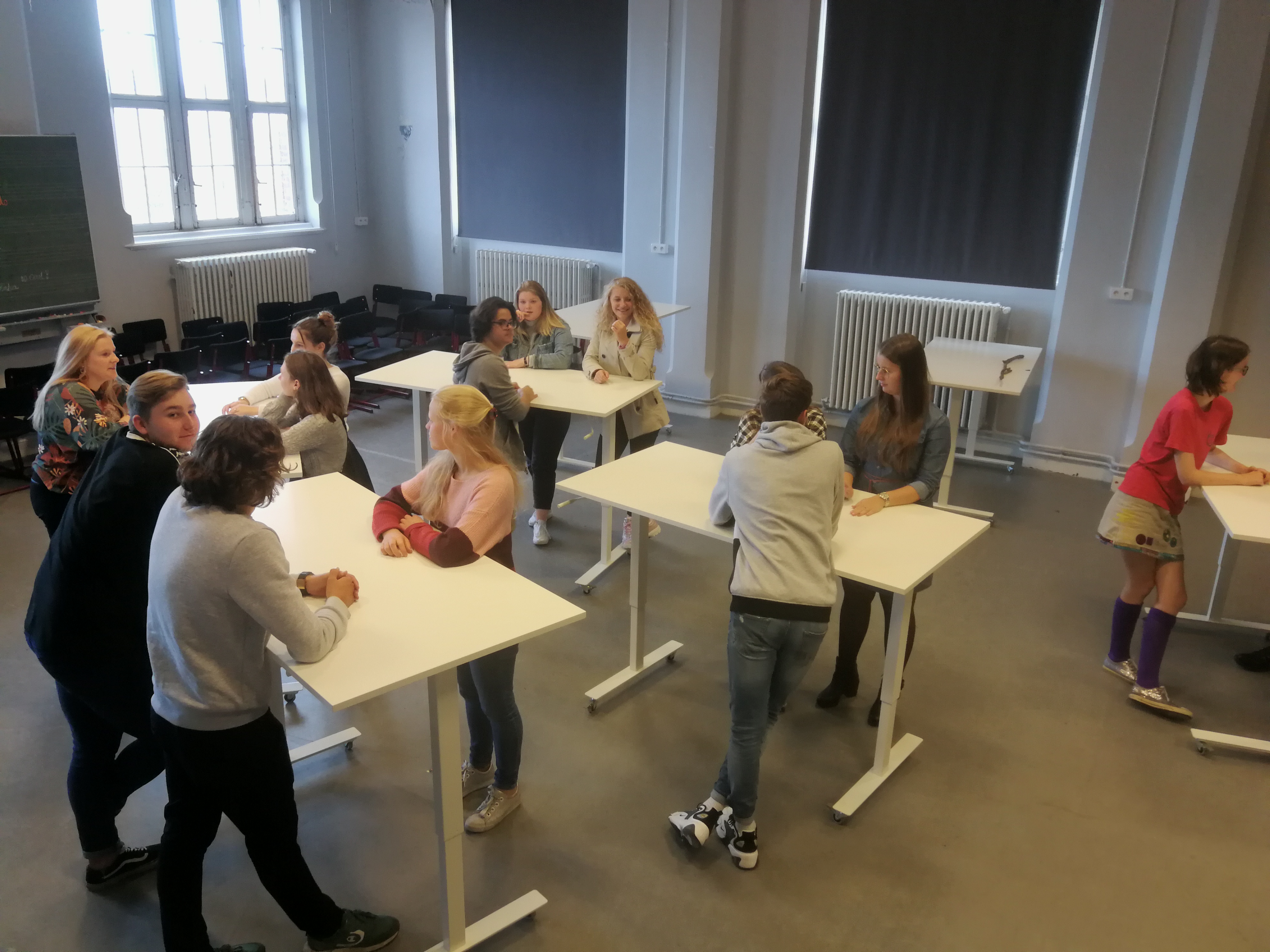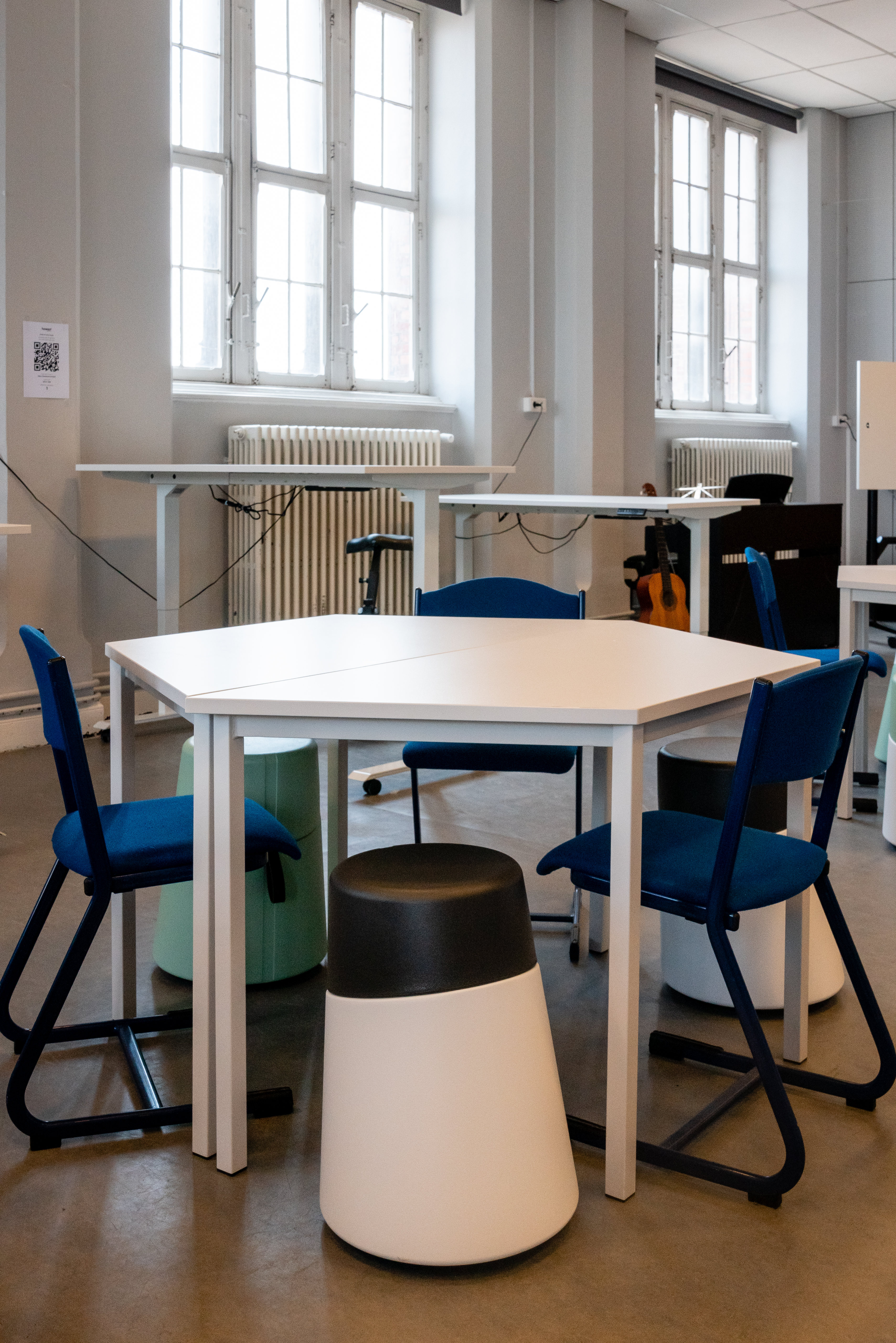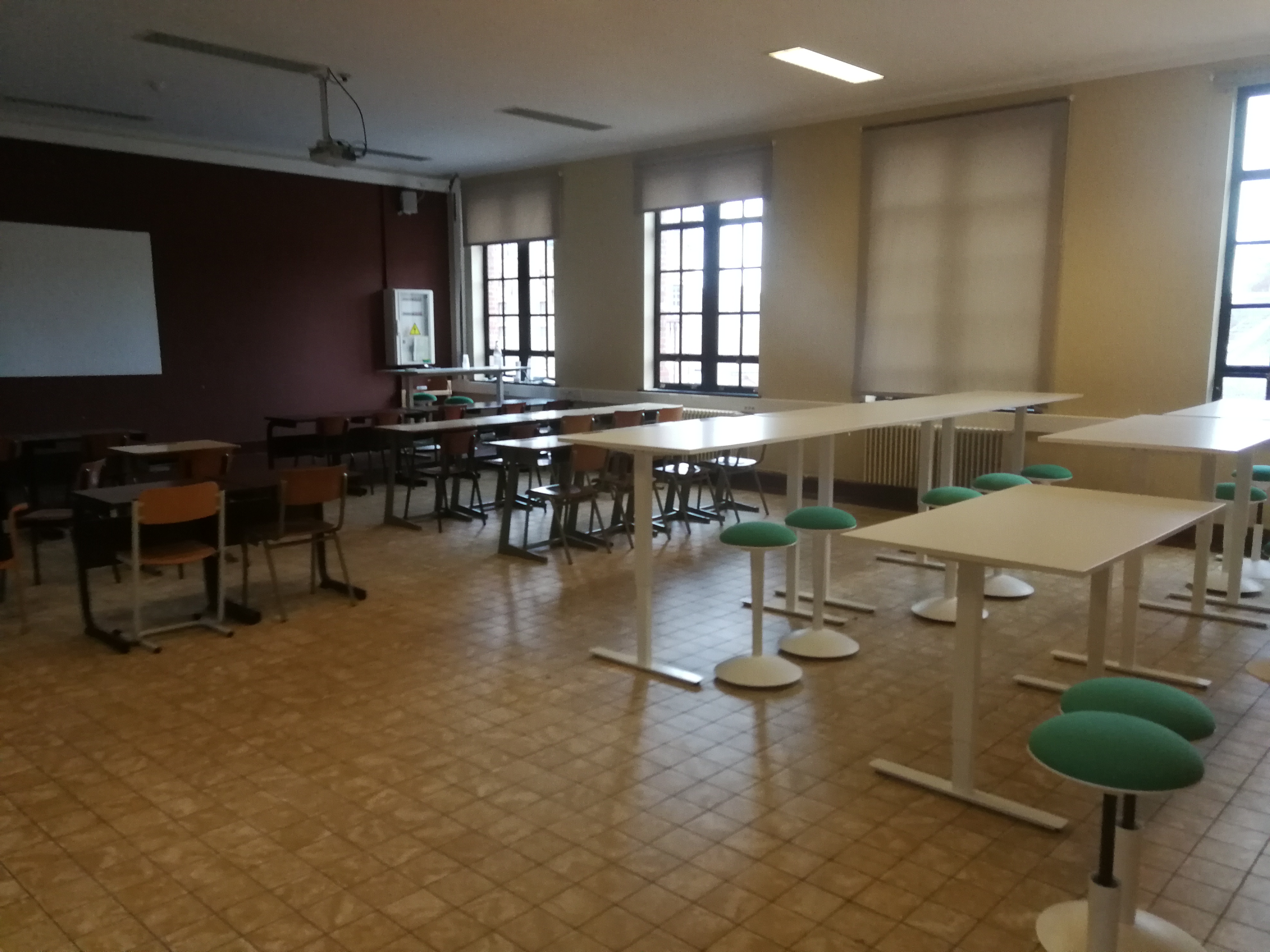 With a minimum investment in a few standing tables from Ikea, we were able to provide several classrooms where can be taught with the option of alternating standing between students. The capacity is maintained in each classroom. For each classroom, we looked for a different arrangement.